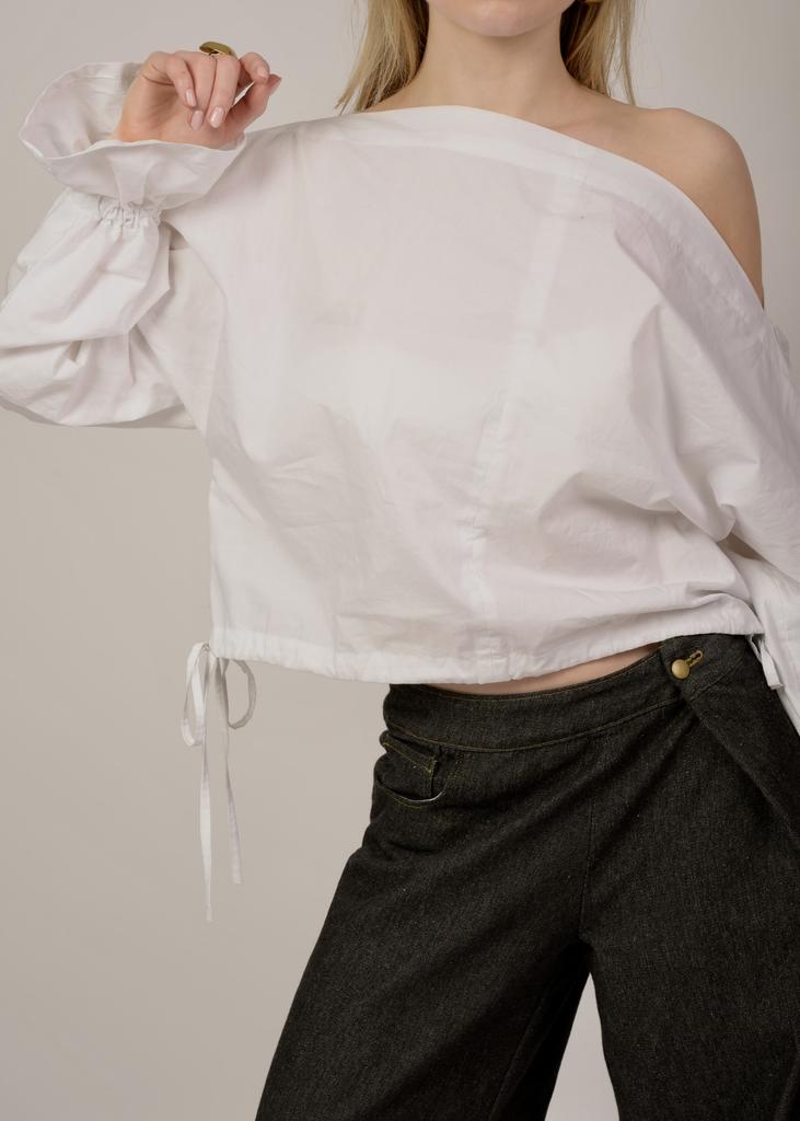 Met het koord aan de onderzijde creëer je moeiteloos verschillende silhouetten. Draag de blouse los, of tailleer de blouse voor extra vorm. De rechte halslijn geeft een moderne, elegante uitstraling, terwijl de uitlopende mouwen zorgen voor een subtiel statement.