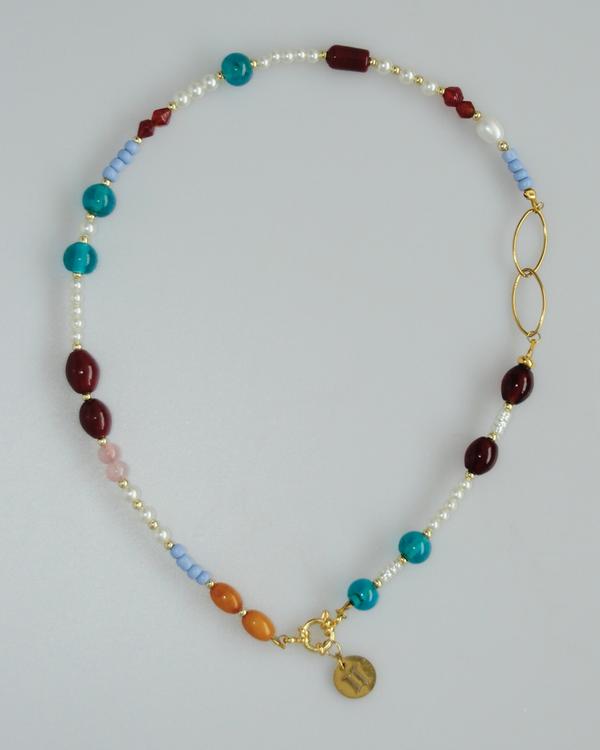 Deze geweldige kleurrijke ketting fleurt elke look op. De ketting is gemaakt van vintage kralen en heeft een mix van gouden stainless steel, en gold-plated details.